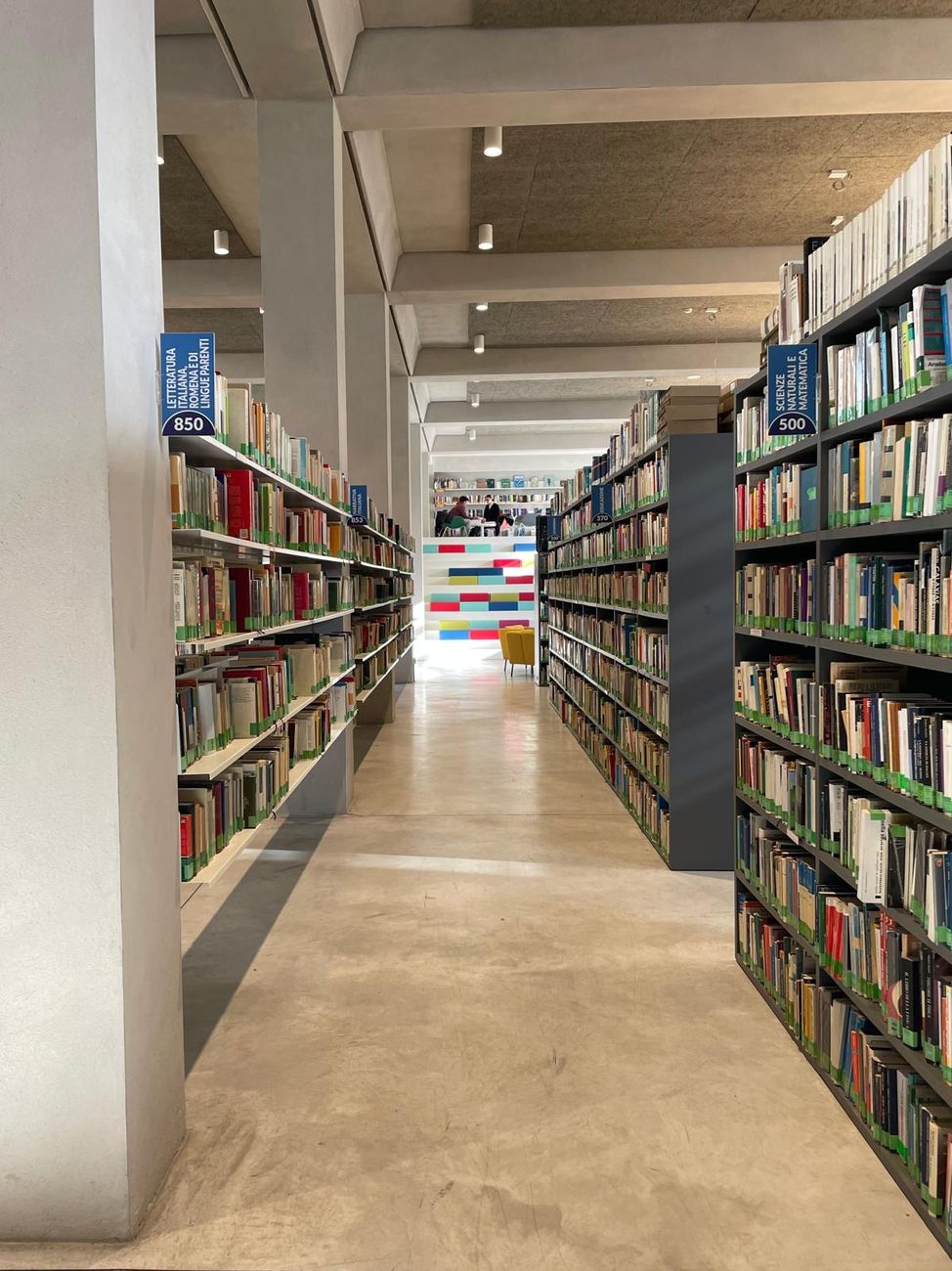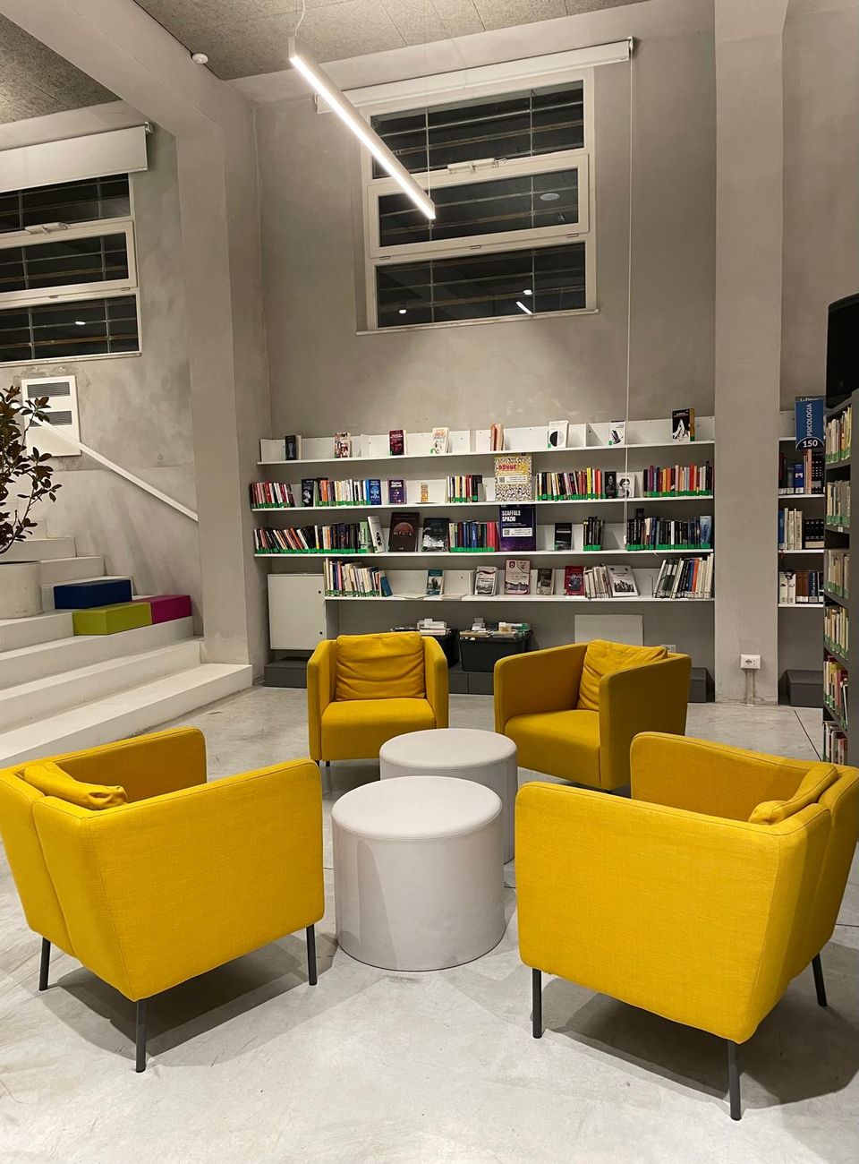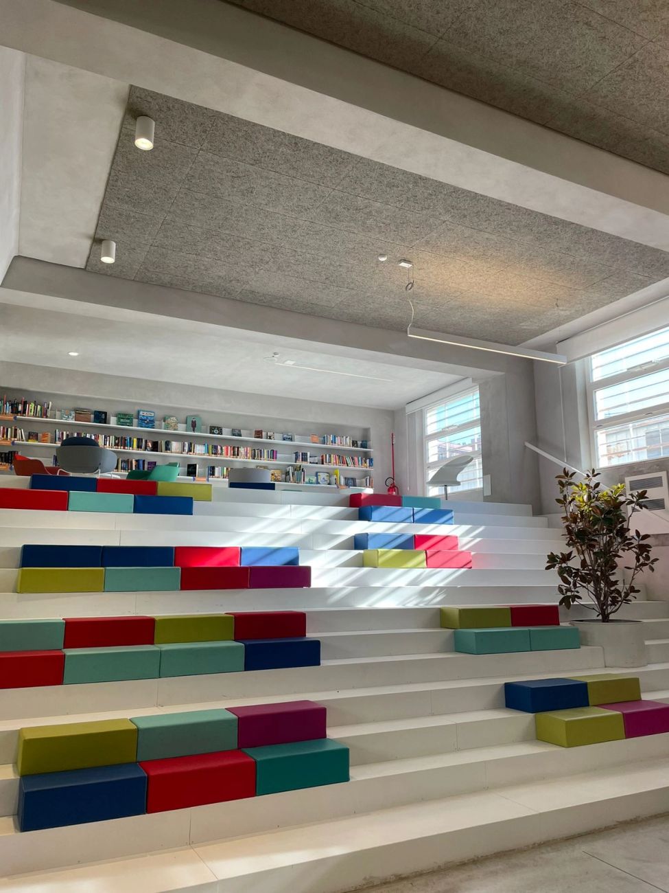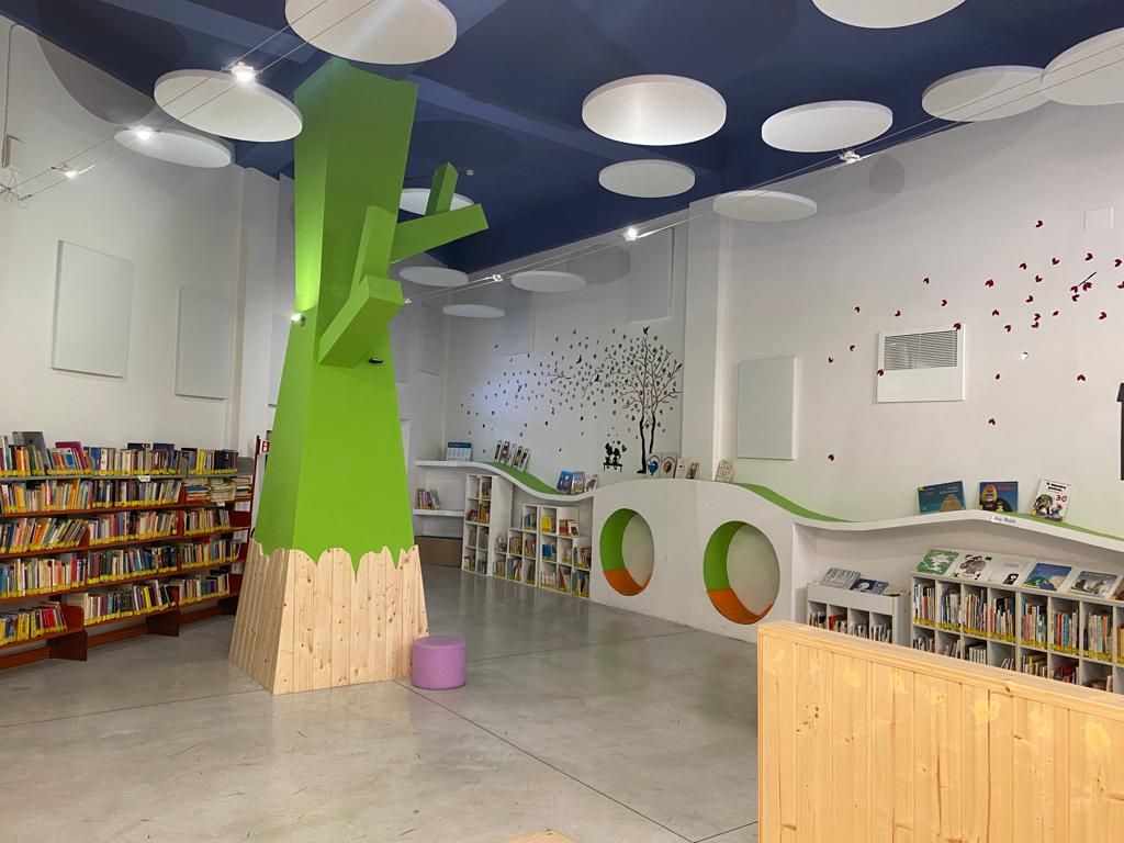 L’impianto iniziale dell’edificio, perfettamente mantenuto e valorizzato, è l’espressione massima della volontà di recupero e di riqualificazione del patrimonio architettonico del complesso monumentale della città di fondazione, ideato e realizzato nella prima metà del novecento. La moderna biblioteca pubblica dispone oggi di un ampio open space di circa 400 mq che ospita libri, servizi e persone, in un luogo dove essere propositivi nel promuovere e facilitare la lettura.