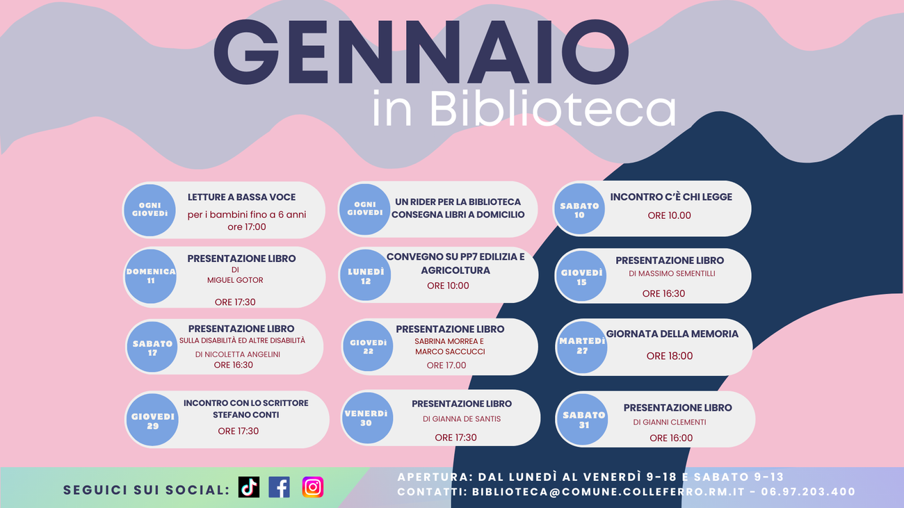 La Biblioteca “Riccardo Morandi” di Colleferro apre il nuovo anno con un calendario ricco di eventi, incontri e iniziative pensate per tutte le età. Anche il mese di gennaio sarà animato da appuntamenti culturali, momenti di condivisione e occasioni per scoprire, leggere e stare insieme.